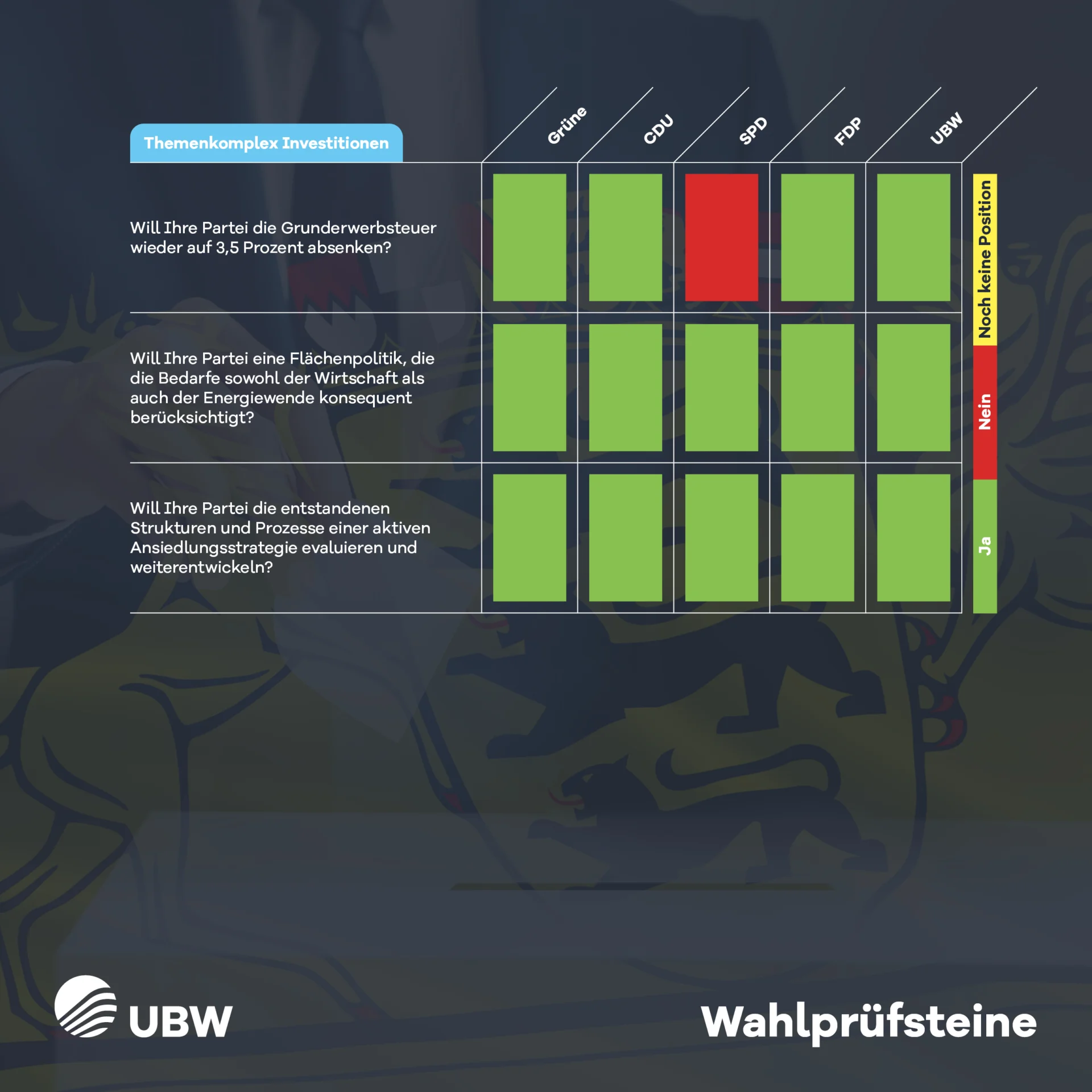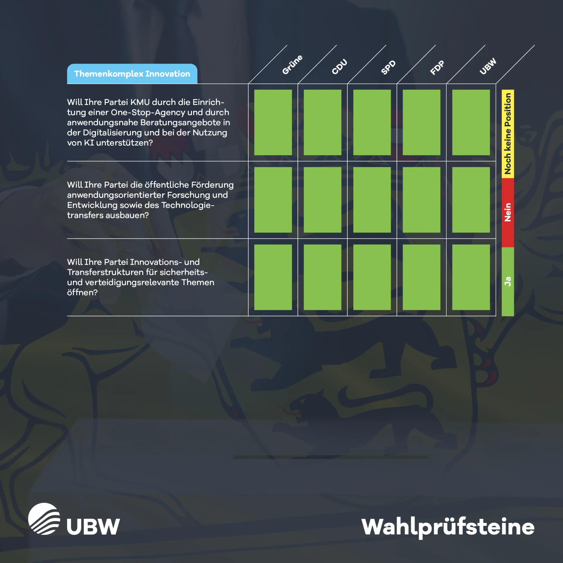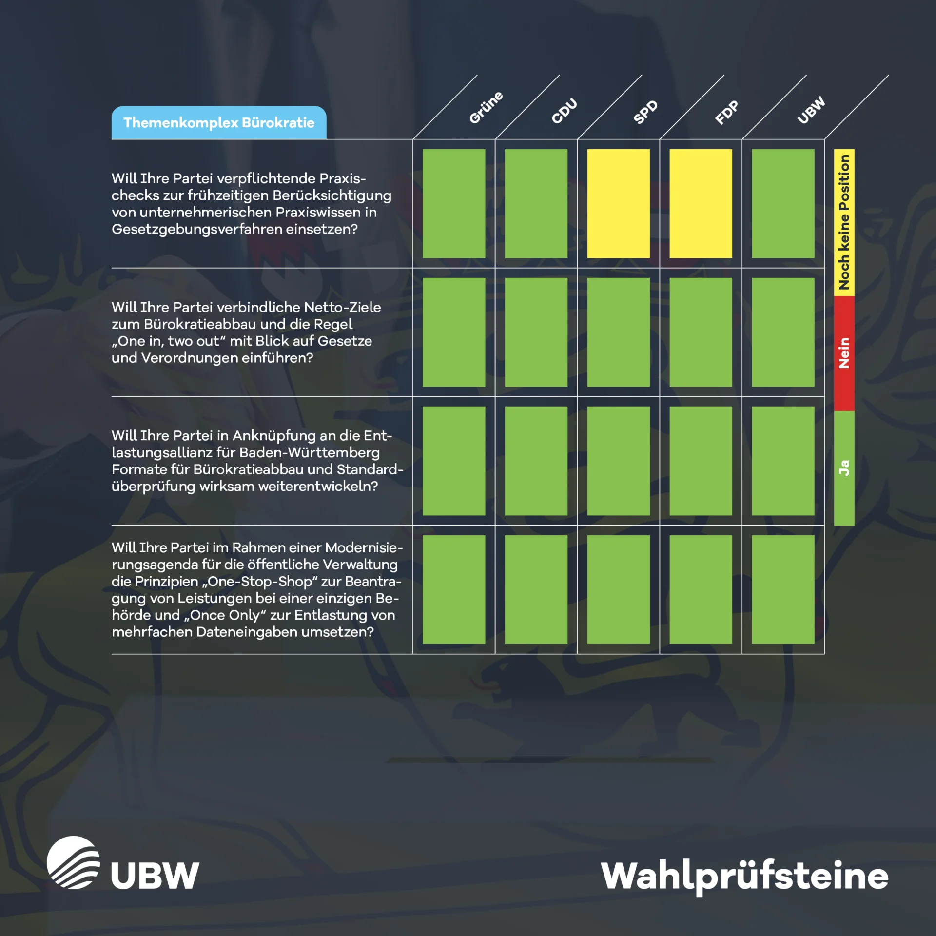 Wir haben den Parteien der demokratischen Mitte 26 Fragen zu den dringendsten Themen für die baden-württembergischen Wirtschaft gestellt. Sehen Sie in unseren Wahlprüfsteinen, wie sich die Parteien bei den Themen im Vergleich zu unseren Forderungen einordnen.